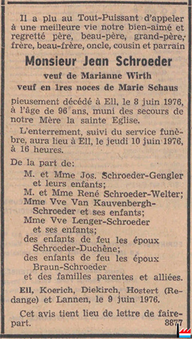 | 10.6.1976 | ![]() Décès Jean Schroeder, à l’âge de 96 ans à Ell, veuf en 1rès noces de Marie Schaus (soeur de Marianne Wirth), veuf en 2es noces de Marianne Wirth (LW: 9.6.1976) |