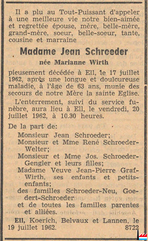 | 17.7.1962 | ![]() Décès de Marianne Wirth, à l’âge de 63 ans à Ell, épouse de Jean Schroeder (LW: 19.7.1962) |