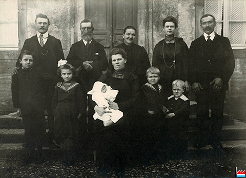 | ~1921 - ~1934 | Jean "Jang" Schroeder, Pächter - gérant de la Ferme Lebrun à Mercy-le-Haut (France) - fermier du Président, 90 ha principalement de blé, 11 chevaux, 30 vaches (Collection industrie.lu) ![]() La famille luxembourgeoise Schroeder, locatrice de la Ferme Lebrun, Mercy-le-Haut (France), devant l'entrée de la maison natale de Albert Lebrun, président de la République française (1932 - 1940) (Collection industrie.lu) 2e rangée: Jean-Pierre Graf-Wirth (+ 19.6.1960 Ell, à l'âge de 69 ans), beau-frère de Jean "Jang" Schroeder - Antoine Schroeder (+ 18.4.1932 Mercy-le-Haut), le père de Jean "Jang" Schroeder - Barbara Schaus, la mère de Marie Schroeder-Schaus,1ère épouse de Jean Schroeder et de Marianne Schroeder-Wirth, 2e épouse de Jean Schroeder - Jean "Jang" Schroeder 1ère rangée: 1 + 2: le grand garçon (Jos. Schroeder ?) et la fille (Anne Marie Schroeder ?) sont le demi-frère et la demi-sœur de René Schroeder-Welter (* 12.1.1923 Mercy-le-Haut), Barbara Schroeder (+ ?) et Antoine Schroeder (+ 18.4.1932) ont été inhumés à Mercy-le-Haut - Marie Graf-Wirth (+ 29.1.1977 Ell, à l'âge de 83 ans), soeur de Marianne Schroeder-Wirth - le bébé + les 2 petits garçons sont ses enfants (Léon Graf-Mossong, Norbert Graf-Clesse (+ 1976 à l'âge de 61 ans), Jean Graf-Reger, Jos. Graf-Hanten ?) (Infos: Jacqueline Lepage-Thill + jmo) |