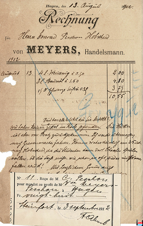 | <=1912 | ![]() Rechnung von Meyers, Handelsmann, Hagen - an: J. Peschon, Hobscheid - 13.8.1912 (Collection: industrie.lu) |
