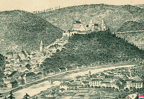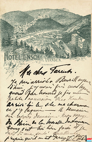 | * 1897 | Hôtel Ensch, Vianden ![]() Hôtel Ensch, Vianden - 17.8.1897 (Carte postale: collection industrie.lu) adressée à Aug.? Doucet de Tillier, Château de Tillier, Leuze Longchamps, Belgique, Province de Namur, par son fils |