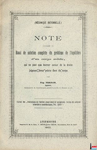 | Note exposant un Essai de solution complète du problème d'équilibre d'un corps solide qui ne peut que tourner autour de la droite joignant deux points fixes du corps | Eug. Ferron, ingénieur | 1902 | Imprimerie de la Cour, V. Bück, successeur, rue du Curé | 7 | |||
