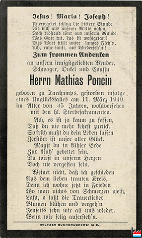 11.3.1940 | ![]() Accident mortel de Poncin Mathias (* Tarchamps), à l'âge de 35 ans (Wiltzer Buchdruckerei; Collection: industrie.lu) |