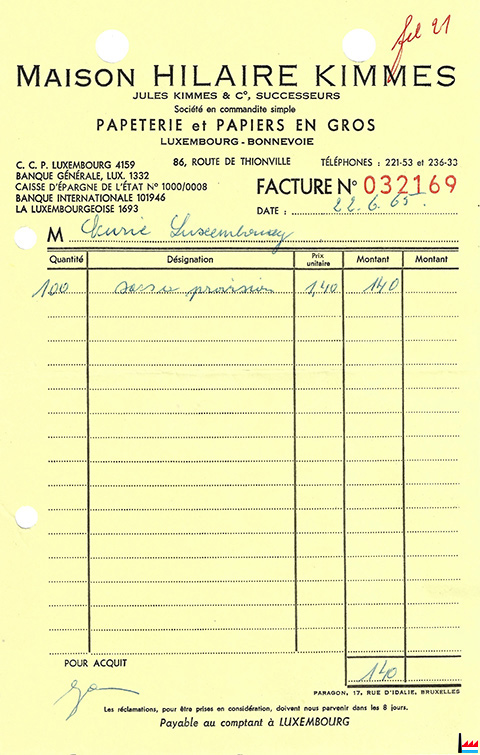 AVIS Nous avons l'honneur d'informer notre honorable clientèle qu'à l'occasion du 25ième anniversaire de notre Etablissement nos magasins et bureaux resteront fermés samedi, le 23 septembre toute la journée. Maison Hilaire Kimmes Papiers en gros LUXEMBOURG-BONNEVOIE. (t : 22.9.1950)