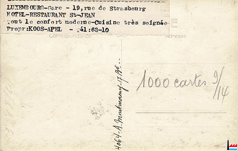 <=9.1936 | ![]() ![]() Hôtel-Restaurant St. Jean, 19 rue de Strasbourg, Luxembourg-Gare (Photo pour 1000 cartes postales 9/14: 4064 - A. Montmorency, 17, Bd M. Lemonnier, Brux.; Collection: industrie.lu) Prop. Koos-Apel tél: 6310 Publicités: Wormeldinger ... Weine - AUSSCHANK HIER; COLUX TAXIS: 4431 jeu de quilles |