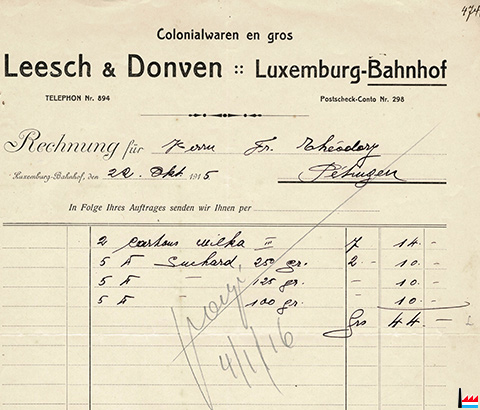 1915 | ![]() Colonialwaren en gros Leesch & Donven, Luxemburg-Bahnhof, tél: 894 - Rechnung vom 22.10.1915 an Fr. Théodory, Pétange (Collection industrie.lu) Milka, Suchard |