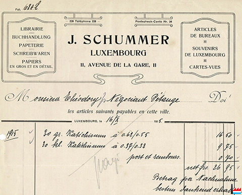 <=10.1915 | ![]() Librairie - Papeterie J. Schummer, Luxembourg, 11 avenue de la Gare, tél: 228 - facture pour M. Théodory, Pétange, négociant (Collection: industrie.lu) Papiers en gros et en détail, articles de bureaux, souvenirs de Luxembourg, cartes-vues |
