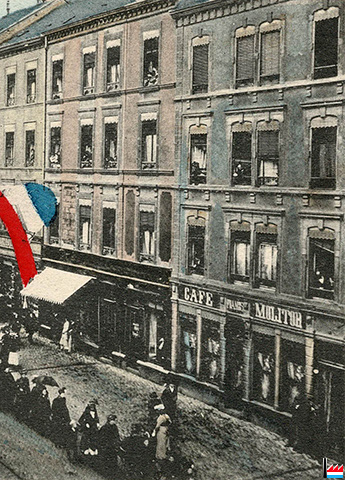 Münchner Kind'l (N° 35?) - Keller Soeurs (N° 35) - Ch. Stein (N° 37) - Hôtel de la Poste (N° 39), Luxembourg (Gare), avenue de la Gare - Rentrée de la troupe (Carte postale: Edition artistique P.C. Schoren, Luxembourg-Gare; Collection: industrie.lu)