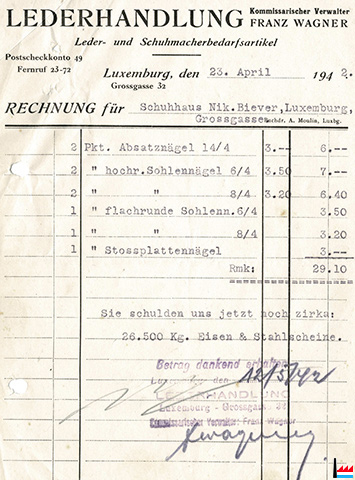 | <=4.1942 | ![]() Lederhandlung - Kommissarischer Verwalter Franz Wagner - 23.4.1942 (Collection: industrie.lu) Leder- und Schumacherbedarfsartikel Luxemburg, 32 Grossgasse, tél: 2372, CCP: 49 |