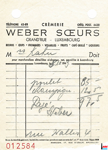 | 1949 | ![]() Weber Soeurs, Grand'rue, Luxembourg, Tél: 4589 - facture du: 8.10.1949 (Collection: industrie.lu) |