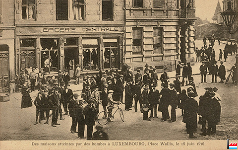 Epicerie Centrale, Luxembourg, N° 9 + 11 rue de Bonnevoie, Place Wallis - 18.6.1916 - Des maisons atteintes par des bombes (Carte postale: Edit. Th. Wirol, Luxembourg-Gare; collection: industrie.lu)