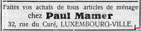 | 32 | ![]() Paul Mamer, Luxembourg, 32 rue du Curé articles de ménage (LIL: 1.11.1932) |