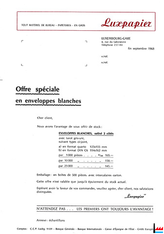 Luxembourg-Gare, 6, rue du Laboratoire Téléphone 257-84 Offre spéciale en enveloppes blanches |