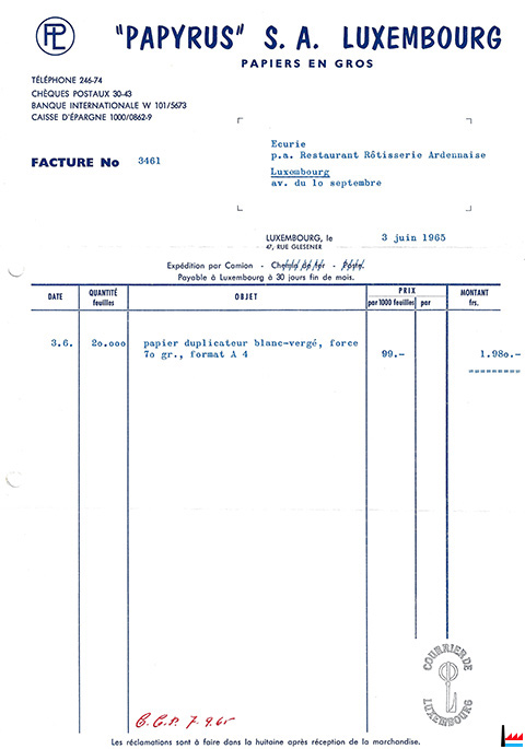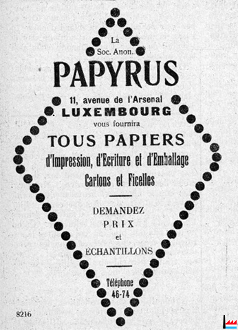 246 74 “PAPYRUS“, S. A., papiers en gros, 47, rue Glesener. (Annuaire officiel des abonnés au téléphone. Novembre 1955) |