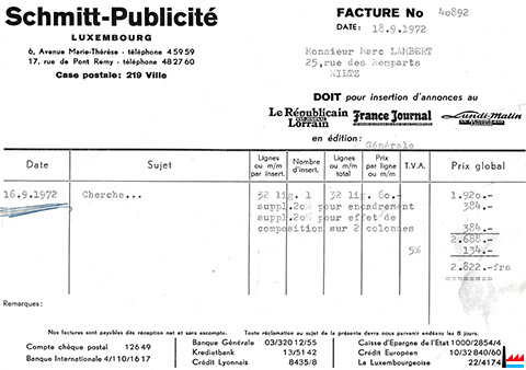 Agence de Publicité et de Presse à Luxembourg - Ville cherche pour entrée immédiate : JEUNE EMPLOYÉE DE BUREAU Se présenter : Schmitt Publicité, 6, Av. Marie-Thérèse, Luxembourg, Tél. 4 59 59 et 470 820 (LW : 6.7.1971) |