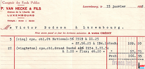 Van Hecke ou Vanhecke Polydore VAN HECKE, agent de change Urbain VAN HECKE, agent de change 38, avenue de la Liberté, Luxembourg 91, rue du Midi, Bruxelles Château Schauwbroek, Vinderhoute, Belgique |