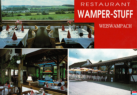 ![]() Restaurant Wamper-Stuff, Weiswampach, 147 route de Stavelot, tél: 98115 (Carte postale:Editions LESAGE GRAPHIC - HOUFFALIZE; Collection: industrie.lu) Face à la Station SHELL - à côté de la Station ESSO |