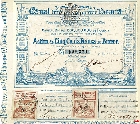 Action de 5000 Francs français de la Compagnie Universelle du Canal Interocéanique de Panama - 1880 (Stern, graveur, Paris; Collection: industrie.lu)