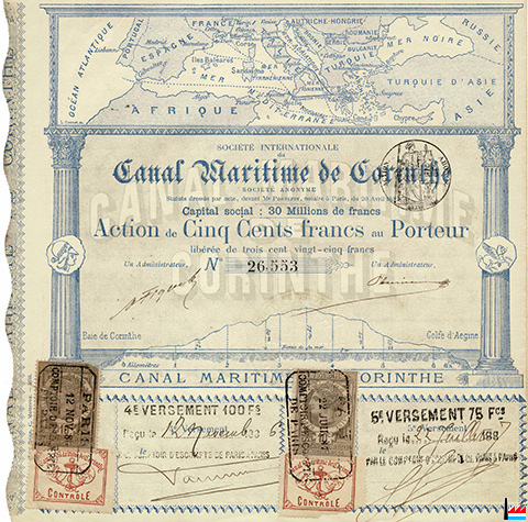 Action de 5000 Francs français de la Société internationale du Canal Maritime de Corinthe, capital: 30 millions de francs français (Collection: industrie.lu) |
