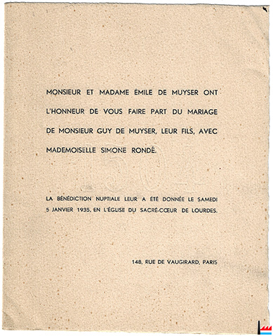 La bénédiction nuptiale leur a été donnée le samedi 5 janvier 1935, en l’église du Sacré-Cœur de Lourdes. 148, rue de Vaugirard, Paris (Collection de Muyser-Huck, Luxembourg)