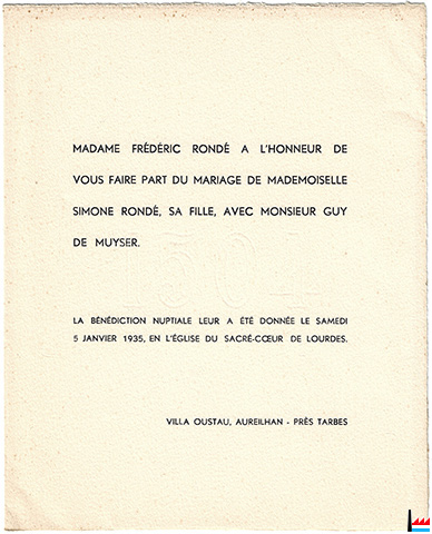 (…) Madame Simone-Henriette-Marie Rondé, épouse de Monsieur Guy-Marie-Edmond-François de Muyser, industriel, avec lequel elle demeure à Argelès-Gazost, (…). (L’Avenir des Hautes-Pyrénées : 17.1.1943) |