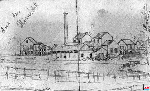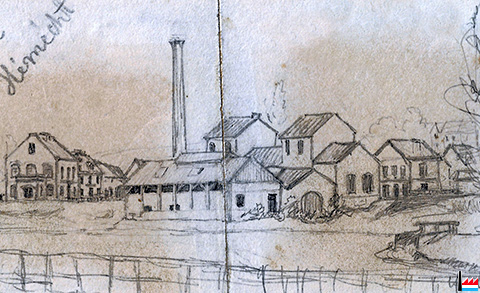 Ancienne fabrique de Roodt s/Syre - vers 1889 - Croquis (8 x 13,5 cm) réalisé par Raymond de Muyser (1872-1949) (Collection de Muyser-Huck)