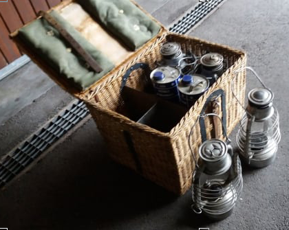 Weidenkorb mit 4 Sturmlaternen, an an der Mëtt Platz fir Petrolsbidonën (anscheinend och vun der schwaizer Arméi)