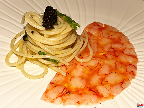 Restaurant Kore, Stengefort - Steinfort - Spaghettis froids, gambas rouges de “Mazara”, citron, salicorne, caviar “Sturia” (Photo: 23.9.2025 jmo)