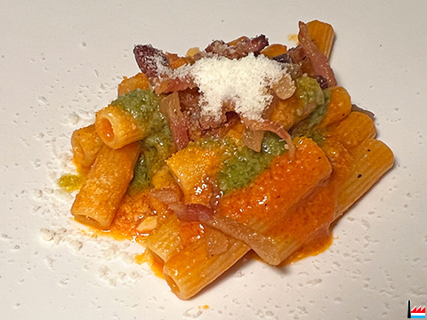 Restaurant Kore, Stengefort - Steinfort - Maccheroni, crème de poivron rouge, pesto à la roquette, guanciale et grana (Photo: 23.9.2025 jmo)