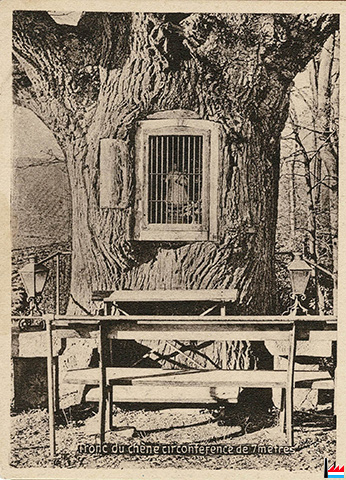 Tronc du chène circonférence de 7 m - Stamm einer Eiche mit einem Umfang von 7 m - Trunk of an oak tree with a circumference of 7 m, Altrier (Extrait carte postale: No. 1 et 1bis - Maison de gros P. Houstraas, Luxembourg & Metz; Collection: industrie.lu)