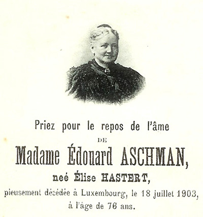 | 18.7.1903 | ![]() Décès de Madame Édouard Aschman, née Élise Hastert, à l’âge de 76 ans. |