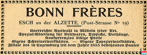 | 1919 | ![]() Ameublements BONN frères, Luxembourg - 1919 (Collection: industrie.lu) Maison fondée en 1855 |