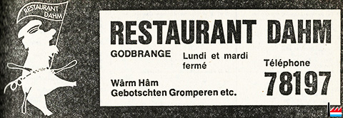 <=1976 | ![]() Restaurant Dahm, Godbrange, tél. 78197 (Collection: industrie.lu) Wârm Hâm, gebotschten Gromperen, etc. |