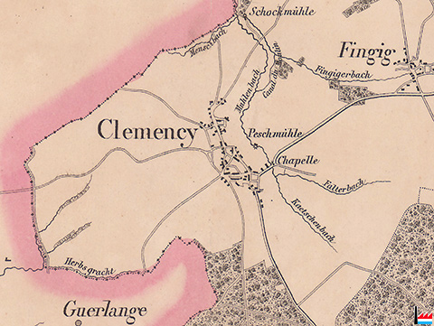 ![]() Kënzeg - Kéinzig - Küntzig - Clemency - Carte Jean-Baptiste Liesch - 1860 ![]() Clemency - Fingig - Carte Jean-Baptiste Liesch - 1860 Schockmühle - Menschbach - Mühlenbach - Fingigerbach - Peschmühle - Falterbach - Kaetschenbach - Herbsgracht |