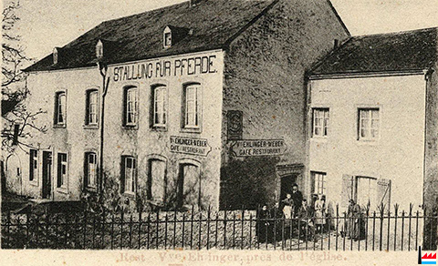 Café - Restaurant Vve Ehlinger-Weber, Dalheim, près de l'Eglise (Extrait carte postale: 597 J.M. Bellwald, Echternach; collection: industrie.lu)