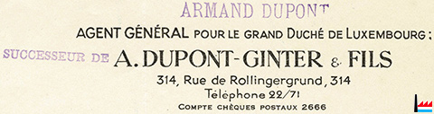 <=6.1935 | ![]() Armand Dupont, successeur de Auguste Dupont-Ginter, Luxembourg, 314 rue de Rollingergrund, tél: 2271 (Collection industrie.lu) |