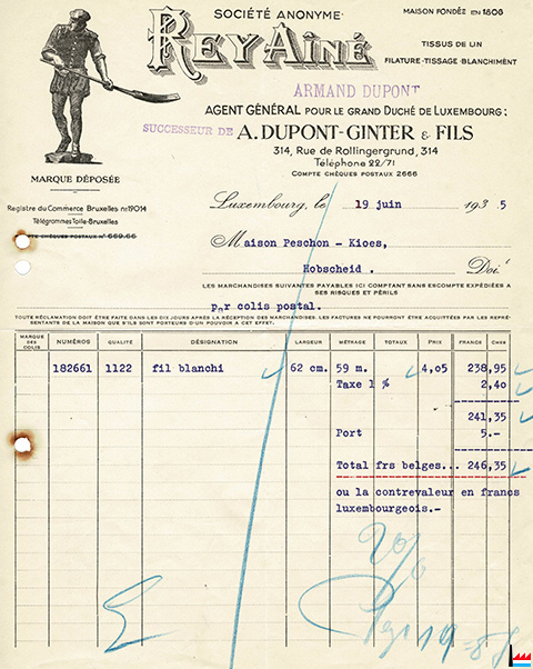 <=6.1935 | ![]() Armand Dupont, successeur de Auguste Dupont-Ginter, Luxembourg, 314 rue de Rollingergrund, tél: 2271 (Collection industrie.lu) Agent général pour le Grand-Duché de Luxembourg de la S.A. Rey Aîné, Bruxelles (Belgique) tissus de lin - filature - tissage - blanchiment |