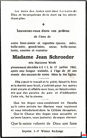 | 17.7.1962 | ![]() Décès de Marianne Wirth, à l’âge de 63 ans à Ell, épouse de Jean Schroeder (LW: 19.7.1962) (Collection industrie.lu) |