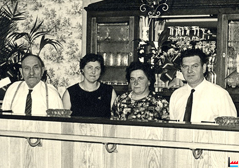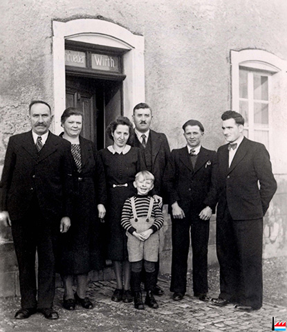 | 25.12.1943 | ![]() Jean Schroeder - Marianne Schroeder-Wirth - Fra? - Jong? - Batty Schroeder - Jos Schroeder - Tony Goedert-Schroeder virum Café Schroeder-Wirth, Ell (Copyright: digitaalt Archiv Romain Gaspar, Kollektioun Famill Schroeder) |