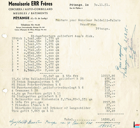 | <=3.1925 | ![]() Menuiserie mécanique Err Antoine, Pétange - facture du 4.3.1925 à Winckel, Bascharage (Collection industrie.lu) Escaliers - Treppenbau, magasin de meubles - grosses Lager in fertigen Möbeln, dépôt de cercueils - Sargmagazin, couronnes - Totenkränze, funéraires - Trauerdekoration, entreprise de tous les travaux du bâtiment - Übernahme sämlicher Bauarbeiten |