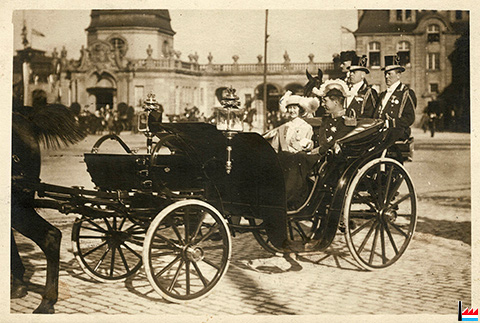 Großherzogin Marie Adelheid mit dem König von Belgien Albert (Albert Ier, roi des Belges) in der großherzoglichen Kutsche am Bahnhof-Luxemburg - 27.-29.4.1914 (Carte postale: Grieser, Luxemburg, Photo-Druck; collection: industrie.lu)