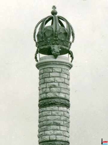 Architecte-paysagiste: Luja Henri Hauteur totale: 13,60 m Socle orné sur 4 faces d'écussons en bronze forgé: dynastie Luxembourg-Bourbon-Nassau, Luxembourg, Mersch. Prix: 120.000 fr (= 3.000 €) Entrepreneur: ? Ferronnerie d'art (couronne, 4 écussons, 4 rubans avec feuilles de chêne, 1 plaque en bronze avec texte de Nicolas Welter): Haagen Michel