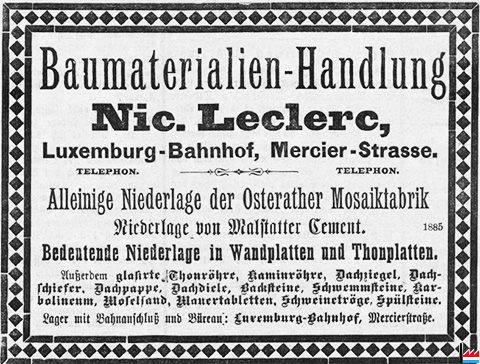 | um 1913 | Übernahme der Baumaterialiengrosshandlung Leclerc, Mercierstraße durch Johann Braun, Mercierstraße, tél: 501 |