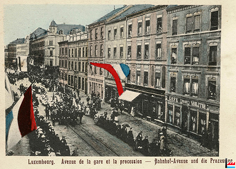 Luxembourg, avenue de la Gare et la procession - Bahnhof-Avenue und die prozession (Carte postale: Collection: industrie.lu)
