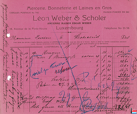 | <=7.1925 | ![]() Mercerie, Bonneterie et Laines en Gros Léon Weber & Scholer, ancienne Maison Edgar Weber, Luxembourg, 14 avenue de la Porte-Neuve, tél: 2138 - 7.1925 (Collection: industrie.lu) maison fondée en 1861 |