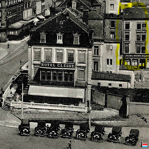 coin droit | ![]() Hôtel Clesse, au coin rue Neyperg - avenue de la Gare, à la Gare centrale de Luxembourg <= 1927 (Carte postale: C. Schoren, photographe d'art, Luxembourg-gare; Collection: industrie.lu) |