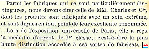 | 1876 | Auguste Charles & Cie Participation à l'Exposition Universelle à Philadelphie |