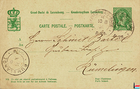 | 8.1896 | ![]() Postkarte von G.H.A. Kaufhold, Luxembourg-Gare an Schmit-Barthel, Grubenbesitzer, Rümelingen - 10.8.1896 (collection: industrie.lu) |