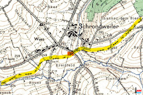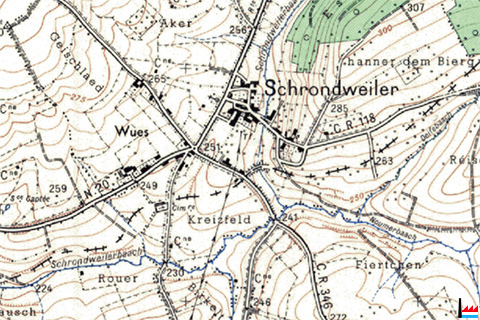 | 1954 | ![]() Schrondweiler - 1954 © Origine Administration du Cadastre et de la Topographie Luxembourg (ACT) - Extrait de la carte topographique - 1954 - Autorisation de publication du 20.10.2010.» |