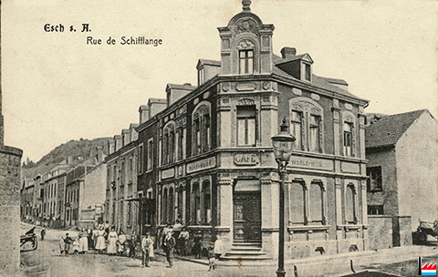 Café Werer-Weis, Esch/Alzette, coin Neudorf - rue de Schifflange - <=8.1909 (Carte postale: G. Sluse, Marbrier, Esch/Alzette; Collection: industrie.lu)